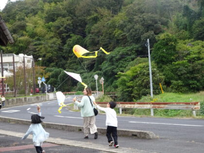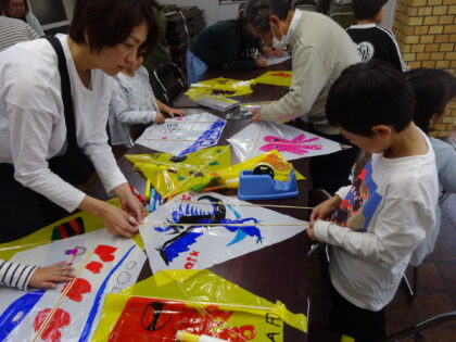 最後にタコ糸をつけて出来上がり・・・ですが、なかなか旨くいかず途中から「おじいちゃんが、遊ぼう」化してるグループも。。