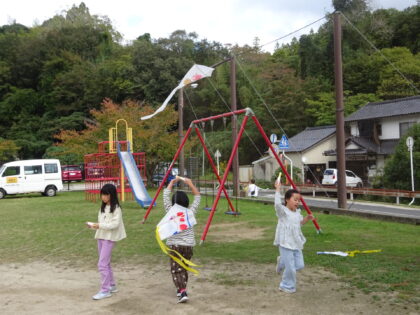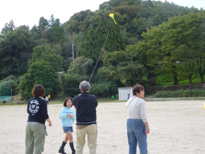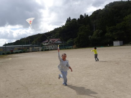 今日は秋晴れ。 みんなで校庭に移動して自作の凧で凧あげをしました。