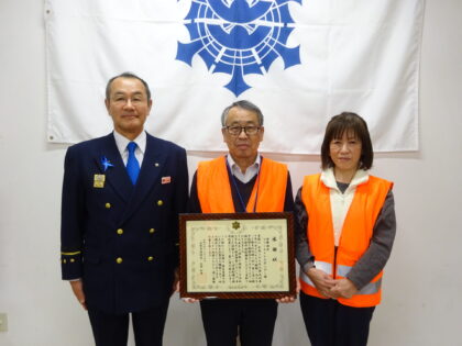 (左から) 矢野消防長 錦織自治協会長 西村隊員