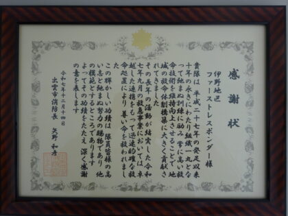 12月14日(日) 伊野FR(ファーストレスポンダー)隊、秋の救命講習会がありましたが、それに合わせて出雲市消防署から感謝状が送られました。