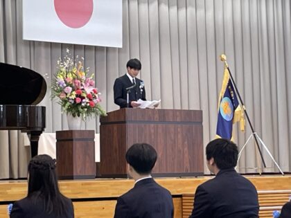 校長先生からの祝辞では、3年間の想い出とともに「Let’s talk」「Let’s try」のメッセージが卒業生たちに贈られました。 そして式の最後を飾る「卒業生代表答辞」は、一年間生徒会長の重職を務めた、東富屋のイット君です。