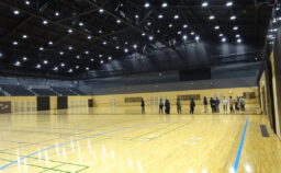 最初に2024年に開館した「だんだんとまとアリーナ」を見学。 金田館長様のご案内で、まだピカピカのアリーナや多目的室を見学しました。