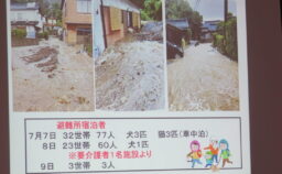山崎センター長から令和3年の大水害の際の惨状や、女性サポート隊をはじめ皆さんの活躍の様子。 そこから新たに学んだ事や日頃から備えておくべき事柄を詳細にご説明頂きました。